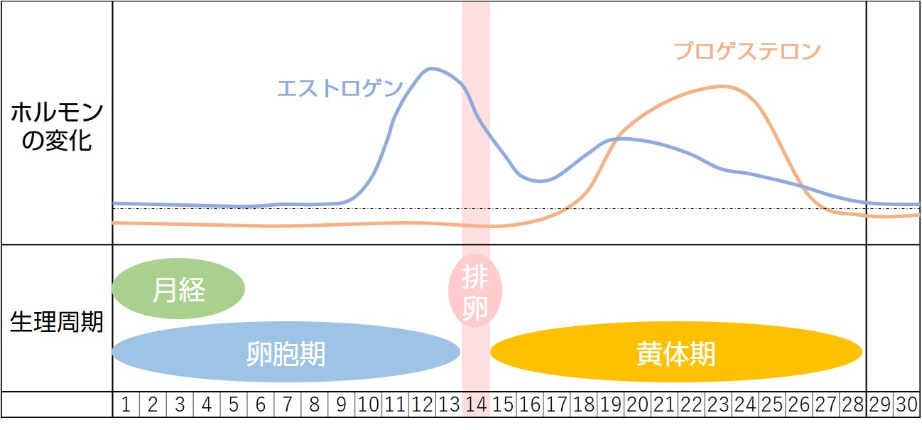 エストロゲン(卵胞ホルモン)は、月経後から徐々に増えていき、排卵前にピークとなります。そして排卵後にもまた多くなります。一方、プロゲステロン(黄体ホルモン)は排卵後から分泌されます。エストロゲンもプロゲステロンも、妊娠しなければ少なくなり月経になります。